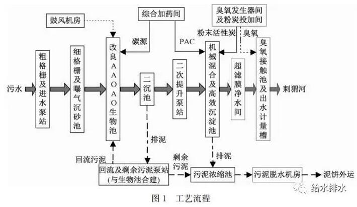 ?。?)深度處理工藝采用混凝+高密度沉淀池+超濾膜+臭氧工藝。該工藝集化學(xué)除磷、高效去除殘余SS和COD、脫色、消毒等多種功能于一體。